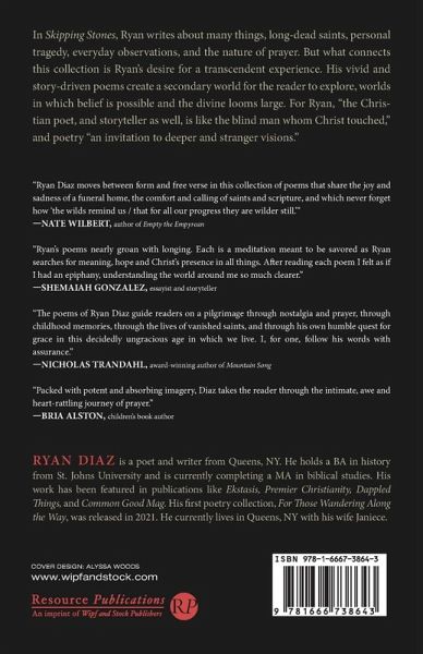 In Skipping Stones, Ryan writes about many things, long-dead saints, personal tragedy, everyday observations, and the nature of prayer. But what connects this collection is Ryan's desire for a transcendent experience. His vivid and story-driven poems create a secondary world for the reader to explore, worlds in which belief is possible and the divine looms large. For Ryan, ""the Christian poet, and storyteller as well, is like the blind man whom Christ touched,"" and poetry ""an invitation to deeper and stranger visions.""