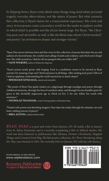 In Skipping Stones, Ryan writes about many things, long-dead saints, personal tragedy, everyday observations, and the nature of prayer. But what connects this collection is Ryan's desire for a transcendent experience. His vivid and story-driven poems create a secondary world for the reader to explore, worlds in which belief is possible and the divine looms large. For Ryan, ""the Christian poet, and storyteller as well, is like the blind man whom Christ touched,"" and poetry ""an invitation to deeper and stranger visions.""