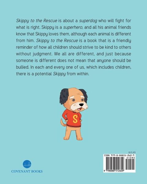 Skippy to the Rescue is about a superdog who will fight for what is right. Skippy is a superhero, and all his animal friends know that Skippy loves them, although each animal is different from him. Skippy to the Rescue is a book that is a friendly reminder of how all children should strive to be kind to others without judgment. We all are different, and just because someone is different does not mean that anyone should be bullied. In each and every one of us, which includes children, there is a potential Skippy from within.