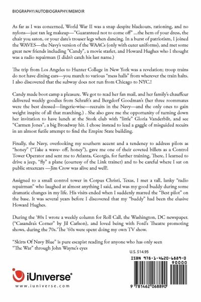 As far as I was concerned, World War II was a snap despite blackouts, rationing, and no nylons-just tan leg makeup-"Guaranteed not to come off " ...the hem of your dress, the chair you sat on, or your date's trouser legs when dancing. In a burst of patriotism, I joined the WAVES-the Navy's version of the WAACs (only with cuter uniforms), and met some great new friends including "Candy", a movie starlet, and Howard Hughes who I thought was a radio repairman (I didn't catch his last name.) The trip from Los Angeles to Hunter College in New York was a revelation; troop trains do not have dining cars-you march to various "mess halls" from wherever the train halts. I also discovered that the subway does not run from Chicago to NYC.! Candy made boot camp a pleasure. We got to read her fan mail, and her family's chauffeur delivered weekly goodies from Schraft's and Bergdorf Goodman's (her three roommates were the best dressed-lingerie-wise-recruits in the Navy-and the only ones to gain weight inspite of all that marching.) . She also gave me the opportunity of turning down her invitation to have lunch at the Stork club with "little" Gloria Vanderbilt, and see "Carmen Jones", a big Broadway hit. I chose instead to lead a gaggle of misguided recuits in an almost futile attempt to find the Empire State building. Finally, the Navy, overlooking my southern accent and a tendency to address pilots as "honey" ("Take a wave- off, honey"), gave me one of their coveted billets as a Control Tower Operator and sent me to Atlanta, Georgia, for further training, There, I learned to drive a jeep, "fly" a plane (courtesy of the Link trainer) and to be careful where I sat on public streetcars -Jim Crow was alive and well!. Assigned to a small control tower in Corpus Christi, Texas, I met a tall, lanky "radio repairman" who laughed at almost anything I said, and was my good buddy during some dramatic changes in my life. His visits ended when I suddenly marred the "Best pilot" on the base. It was several years before I discovered that my "buddy" had been the elusive Howard Hughes. During the '80s I wrote a weekly column for Roll Call, the Washington, DC newspaper. ("Casandra's Corner" by Jil Carlson), and loved being with Ford's Theatre promoting shows, during the 70s.'The '60s were spent doing my own TV show. "Skirts Of Navy Blue" is pure escapist reading for anyone who has only seen "The War" through John Wayne's eyes.