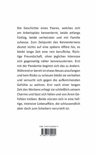 Die Geschichte eines Paares, welches sich am Arbeitsplatz kennenlernt, beide anfangs fünfzig, beide verheiratet und mit Familie zuhause. Zum Zeitpunkt des Kennenlernens deutet nichts auf eine spätere Affäre hin, es bleibt lange Zeit eine rein berufliche, flüchtige Freundschaft, ohne jegliches Interesse sich gegenseitig näher kennenzulernen. Erst mit der Pandemie beginnt sich das zu ändern. Während er bereit ist etwas Neues anzufangen und kein Risiko zu scheuen bleibt sie verhalten und versucht sich gegen die aufkommenden Gefühle zu wehren. Erst nach einer langen Zeit des Werbens erliegt sie schließlich seinem Charme und lässt sich fallen und von ihren Gefühlen treiben. Beide stürzen sich in eine heftige, intensive Liebesaffäre, die schlussendlich aber doch zum Scheitern verurteilt ist.