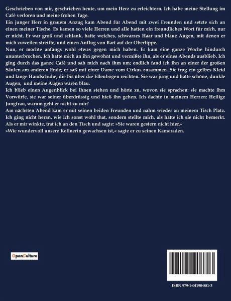 Geschrieben von mir, geschrieben heute, um mein Herz zu erleichtern. Ich habe meine Stellung im Café verloren und meine frohen Tage. Ein junger Herr in grauem Anzug kam Abend für Abend mit zwei Freunden und setzte sich an einen meiner Tische. Es kamen so viele Herren und alle hatten ein freundliches Wort für mich, nur er nicht. Er war groß und schlank, hatte weiches, schwarzes Haar und blaue Augen, mit denen er mich zuweilen streifte, und einen Anflug von Bart auf der Oberlippe. Nun, er mochte anfangs wohl etwas gegen mich haben. Er kam eine ganze Woche hindurch ununterbrochen. Ich hatte mich an ihn gewöhnt und vermißte ihn, als er eines Abends ausblieb. Ich ging durch das ganze Café und sah mich nach ihm um; endlich fand ich ihn an einer der großen Säulen am anderen Ende; er saß mit einer Dame vom Cirkus zusammen. Sie trug ein gelbes Kleid und lange Handschuhe, die bis über die Ellenbogen reichten. Sie war jung und hatte schöne, dunkle Augen, und meine Augen waren blau. Ich blieb einen Augenblick bei ihnen stehen und hörte zu, wovon sie sprachen: sie machte ihm Vorwürfe, sie war seiner überdrüssig und hieß ihn gehen. Ich dachte in meinem Herzen: Heilige Jungfrau, warum geht er nicht zu mir? Am nächsten Abend kam er mit seinen beiden Freunden und nahm wieder an meinem Tisch Platz. Ich ging nicht heran, wie ich sonst wohl that, sondern stellte mich, als hätte ich sie nicht bemerkt. Als er mir winkte, trat ich an den Tisch und sagte: »Sie waren gestern nicht hier.« »Wie wundervoll unsere Kellnerin gewachsen ist,« sagte er zu seinen Kameraden.