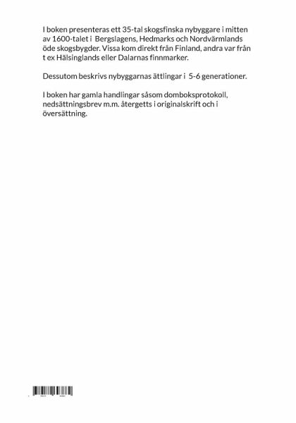 I boken presenteras ett 35-tal skogsfinska nybyggare i mitten av 1600-talet i Bergslagens, Hedmarks och Nordvärmlands öde skogsbygder. Vissa kom direkt från Finland, andra var från t ex Hälsinglands eller Dalarnas finnmarker. Dessutom beskrivs nybyggarnas ättlingar i 5-6 generationer. I boken har gamla handlingar såsom domboksprotokoll, nedsättningsbrev m.m. återgetts i originalskrift och i översättning.