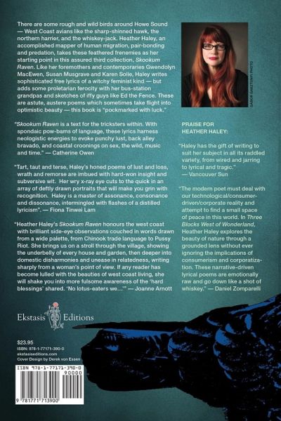 There are some rough and wild birds around Howe Sound - West Coast avians like the sharp-shinned hawk, the northern harrier, and the whiskey-jack. Heather Haley, an accomplished mapper of human migration, pair-bonding and predation, takes these feathered frenemies as her starting point in this assured third collection, Skookum Raven. Like her foremothers and contemporaries Gwendolyn MacEwen, Susan Musgrave and Karen Solie, Haley writes sophisticated free lyrics of a witchy feminist kind - but adds some proletarian ferocity with her bus-station grandpas and sketches of iffy guys like Ed the Fence. These are astute, austere poems which sometimes take flight into optimistic beauty - this book is 'pockmarked with luck.'