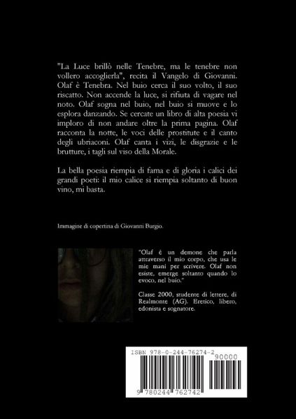 Prima silloge poetica di Olaf e tre esercizi di narrativa flash. Canto confuso di strada, gocce di sangue nero su fogli troppo bianchi. Se vi piace l'alta poesia evitate questo libro: si colmino di fama e gloria soltanto i calici dei grandi poeti. Al mio calice basta un po' di buon vino.