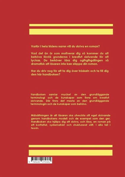 När du bestämt dig för att skriva en roman så gör det. Bara sätt igång och njut av skapandeprocessen. Ibland kommer det att ta emot av olika orsaker och då kommer den här handboken att vara ett nödvändigt stöd. Om du inte redan gjort det kommer du så småningom att upptäcka principen att det gäller att förstå reglerna innan man bryter mot dem. I handboken presenteras en fungerande skrivprocess och en strukturerad modell för den spagettiröra av metoder och begrepp som tagits fram under hundratals år. En utveckling som accelererats under de senaste decennierna när skrivande blivit ett folknöje. Ett akademiskt perspektiv blandas med personliga reflektioner. Det finns många sätt att presentera skrivande. Det är till exempel en konstnärlig och helande process. I handboken bygger angreppssättet i stället på kreativt skrivande utgående från de komponenter som bygger upp en roman. Ansatsen till strukturering av innehållet kombinerat med ambitionen att ge en helhetssyn över skrivprocessen leder ofelbart till en del överlapp i handboken. Med en lämplig mängd repetition kan läsaren använda den både från pärm till pärm och för att specialstudera avsnitt som matchar speciella problem under arbetet. En summarisk lista över de viktigaste är berättelse-komponenterna Handling om, Karaktär, Handling av, Relation och Dialog. För ett ännu bättre resultat bör avsnitten om Dramaturgi och Gestaltning läsas noggrant. I samband med att gestaltning diskuteras gör handboken en djupdykning i det närmast mytiska begreppet "Visa inte berätta". För att ännu bättre kunna förstå texter och sig själv som författare har avsnitten om Stil och Estetik lagts till. Lämpligt nog avslutas handboken med stöd för Efterarbetet. En tidsödande konstart som går att strukturera så att den inte slukar författaren. Genom hela handboken ges massvis av exempel. Ibland korta på några rader och ibland längre exempel som omfattar hela genrer, som spänningsromaner och feelgood.