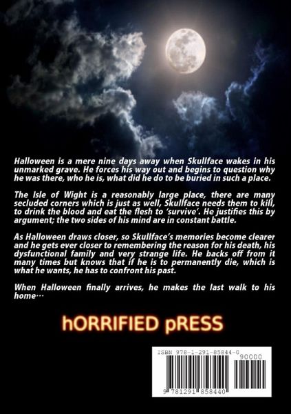 Halloween is a mere nine days away when Skullface wakes in his unmarked grave. He forces his way out and begins to question why he was there, who he is, what did he do to be buried in such a place. The Isle of Wight is a reasonably large place, there are many secluded corners which is just as well, Skullface needs them to kill, to drink the blood and eat the flesh to 'survive'. He justifies this by argument; the two sides of his mind are in constant battle. As Halloween draws closer, so Skullface's memories become clearer and he gets ever closer to remembering the reason for his death, his dysfunctional family and very strange life. He backs off from it many times but knows that if he is to permanently die, which is what he wants, he has to confront his past. When Halloween finally arrives, he makes the last walk to his home...