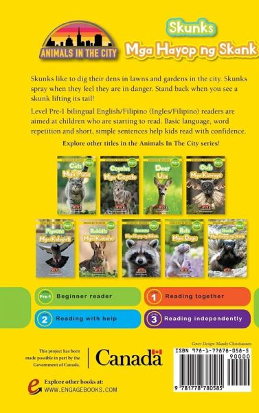 Skunks like to dig their dens in lawns and gardens in the city. Skunks spray when they feel they are in danger. Stand back when you see a skunk lifting its tail! Level Pre-1 bilingual English/Filipino (Ingles/Filipino) readers are aimed at children who are starting to read. Basic language, word repetition and short, simple sentences help kids read with confidence. This project has been made possible in part by the Government of Canada.