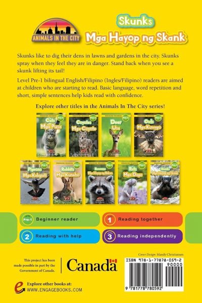 Skunks like to dig their dens in lawns and gardens in the city. Skunks spray when they feel they are in danger. Stand back when you see a skunk lifting its tail! Level Pre-1 bilingual English/Filipino (Ingles/Filipino) readers are aimed at children who are starting to read. Basic language, word repetition and short, simple sentences help kids read with confidence. This project has been made possible in part by the Government of Canada.