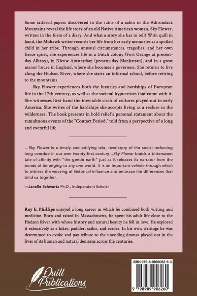 Some tattered papers discovered in the ruins of a cabin in the Adirondack Mountains reveal the life story of an old Native American woman, Sky Flower, written in the form of a diary. And what a story she has to tell! With quill in hand, the Mohawk writer records her life from her early memories as a spoiled child in her tribe. Through unusual circumstances, tragedies, and her own fierce spirit, she experiences life in a Dutch colony (Fort Orange at present-day Albany), in New Amsterdam (present-day Manhattan), and in a great manor house in Littleton, England, where she becomes a governess. There she discovers that one of the children under her care is deaf. Her compassion and familiarity with Native sign language help bring the girl out of her shell. A romantic interlude results in a broken heart and Sky Flower returns to live along the Hudson River, where she starts an informal school, before retiring to the mountains. Sky Flower experiences both the luxuries and hardships of European life in the 17th century, as well as the societal hypocrisies that come with it. She witnesses first-hand the inevitable clash of cultures played out in early America. She writes of the hardships she accepts living as a recluse in the wilderness. The book presents in bold relief a personal statement about the tumultuous events of the "Contact Period," told from a perspective of a long and eventful life. The book concludes with an overview and a timeline that give the story additional historical context by noting key events in Europe and Colonial America during Sky Flower's tumultuous life.