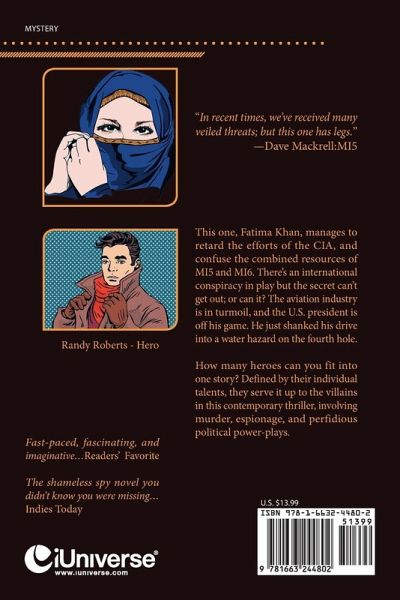 "In recent times, we've received many veiled threats; but this one has legs." -Dave Mackrell:MI5 This one, Fatima Khan, manages to retard the efforts of the CIA, and confuse the combined resources of MI5 and MI6. There's an international conspiracy in play but the secret can't get out; or can it? The aviation industry is in turmoil, and the U.S. president is off his game. He just shanked his drive into a water hazard on the fourth hole. How many heroes can you fit into one story? Defined by their individual talents, they serve it up to the villains in this contemporary thriller, involving murder, espionage, and perfidious political power-plays. Fast-paced, fascinating, and imaginative...Readers' Favorite The shameless spy novel you didn't know you were missing...Indies Today