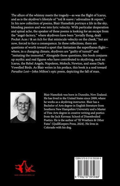 In his new collection of poems, Blair Hamelink portrays a life in the sky, blending his passion and woe with lyric velocity. In this book, the allure of the whimsy inevitably meets the tragedy, as was the flight of Icarus, and as is the skydiver's lifestyle of "toil & suave / adrenaline & repent." With particular desperation and spinal ache, the speaker of these poems seems to be looking for an escape from the "angel-factory," where skydivers have been "jovially flung, dealt Pocket Aces / & an itch for that miniscule velocity on the cheek." In these reflections, there are questions of worth toward a sport that fantasizes the superfluous flight, and questions of morale toward skydivers who are "guilty of tumult" and "imitating the immortal." Alongside those questions, this book conjures up mythic and real figures who have contributed to skydiving, such as: Icarus, the Rebel Angels, da Vinci, Napoleon, Moloch, Newton, and some Dark-Vowelled Birds. As Blair writes in his preface, this book is a nod toward Paradise Lost, John Milton's epic poem depicting the fall of mankind, who, much like today's skydivers, were so consumed by temptation and revolt.