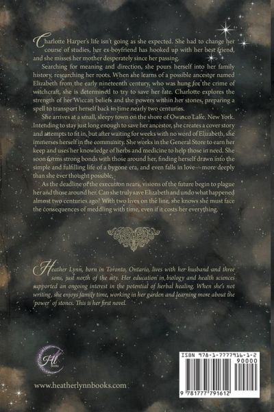 Charlotte Harper's life isn't going as she expected. She had to change her course of studies, her ex-boyfriend has hooked up with her best friend, and she misses her mother desperately since her passing. Searching for meaning and direction, she pours herself into her family history, researching her roots. When she learns of a possible ancestor named Elizabeth from the early nineteenth century, who was hung for the crime of witchcraft, she is determined to try to save her fate. Charlotte explores the strength of her Wiccan beliefs and the powers within her stones, preparing a spell to transport herself back in time nearly two centuries. She arrives at a small, sleepy town on the shore of Owasco Lake, New York. Intending to stay just long enough to save her ancestor, she creates a cover story and attempts to fit in, but after waiting for weeks with no word of Elizabeth, she immerses herself in the community. She works in the General Store to earn her keep and uses her knowledge of herbs and medicine to help those in need. She soon forms strong bonds with those around her, finding herself drawn into the simple and fulfilling life of a bygone era, and even falls in love-more deeply than she ever thought possible. As the deadline of the execution nears, visions of the future begin to plague her and those around her. Can she truly save Elizabeth and undo what happened almost two centuries ago? With two lives on the line, she knows she must face the consequences of meddling with time, even if it costs her everything.