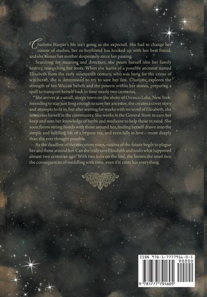 Charlotte Harper's life isn't going as she expected. She had to change her course of studies, her ex-boyfriend has hooked up with her best friend, and she misses her mother desperately since her passing. Searching for meaning and direction, she pours herself into her family history, researching her roots. When she learns of a possible ancestor named Elizabeth from the early nineteenth century, who was hung for the crime of witchcraft, she is determined to try to save her fate. Charlotte explores the strength of her Wiccan beliefs and the powers within her stones, preparing a spell to transport herself back in time nearly two centuries. She arrives at a small, sleepy town on the shore of Owasco Lake, New York. Intending to stay just long enough to save her ancestor, she creates a cover story and attempts to fit in, but after waiting for weeks with no word of Elizabeth, she immerses herself in the community. She works in the General Store to earn her keep and uses her knowledge of herbs and medicine to help those in need. She soon forms strong bonds with those around her, finding herself drawn into the simple and fulfilling life of a bygone era, and even falls in love-more deeply than she ever thought possible. As the deadline of the execution nears, visions of the future begin to plague her and those around her. Can she truly save Elizabeth and undo what happened almost two centuries ago? With two lives on the line, she knows she must face the consequences of meddling with time, even if it costs her everything.