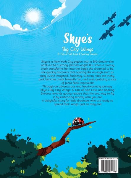 Join Skye, a NYC pigeon turned eagle, on a thrilling adventure to learn self-love. Discover that embracing yourself is the best way to soar. Perfect for little dreamers ready to fly high! In Skye's Big-City Wings: A Tale of Self-Love and Soaring Dreams, readers are introduced to Skye, an ordinary pigeon with an extraordinary dream. Skye longs to be a strong, brave eagle, ruling the skies with grace and power. Imagine her surprise when she finds herself transformed into the mighty bird she's always wanted to be! But she soon finds out that being an eagle in the bustling city of New York isn't as simple as she thought. Subway rides become a challenge, park benches creak under her newfound size, and even a slice of pizza, a staple in a pigeon's diet, is now a task! Skye's dream has turned into an exciting yet confusing journey. Through her trials and tribulations, Skye starts to understand that sometimes, dreams are not as they seem. Skye's Big-City Wings is a tale that goes beyond the fantasy of transformation. It's a story that teaches the importance of self-acceptance and love. Skye learns that she doesn't need to be an eagle to feel strong or fearless. She discovers that the best way to truly soar is to be yourself and embrace your unique qualities. This delightful narrative is sure to captivate young minds, encouraging them to be proud of who they are and to hold onto their dreams. It's a perfect read for those ready to spread their wings and fly, showing them that they're perfect, just the way they are! Skye's Big-City Wings will make everyone believe that they too can soar high, not by changing who they are, but by loving themselves. A heartening adventure that will leave every reader, young and old, inspired and filled with self-love and confidence.
