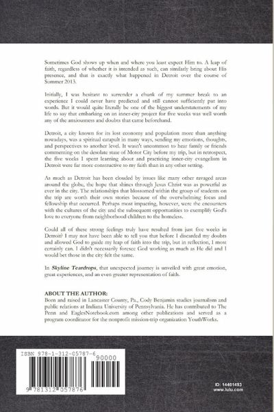 In Skyline Teardrops, Cody Benjamin recalls his experiences volunteering, struggling and growing alongside nine other students from around the country. Pressed to make an impact in Detroit, a city that seems to be known more for its devastation than anything else, he dives into the importance of urban youth, explores the historic downfall of Motor City and, most importantly, exercises an immense walk of faith that changes his perspective on far more than the surrounding broken neighborhoods.