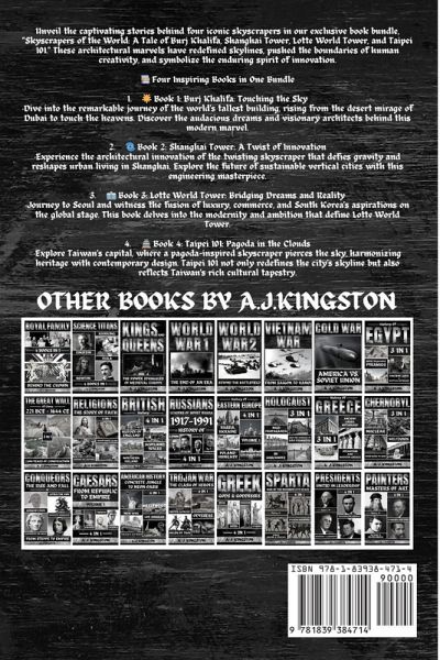 ¿¿¿¿ Explore the Skyscrapers of the World ¿¿¿¿¿ Unveil the captivating stories behind four iconic skyscrapers in our exclusive book bundle, "Skyscrapers of the World: A Tale of Burj Khalifa, Shanghai Tower, Lotte World Tower, and Taipei 101." These architectural marvels have redefined skylines, pushed the boundaries of human creativity, and symbolize the enduring spirit of innovation. ¿¿¿¿ Four Inspiring Books in One Bundle 1.¿¿¿¿ Book 1: Burj Khalifa: Touching the Sky ¿Dive into the remarkable journey of the world's tallest building, rising from the desert mirage of Dubai to touch the heavens. Discover the audacious dreams and visionary architects behind this modern marvel. 2.¿¿¿¿ Book 2: Shanghai Tower: A Twist of Innovation ¿Experience the architectural innovation of the twisting skyscraper that defies gravity and reshapes urban living in Shanghai. Explore the future of sustainable vertical cities with this engineering masterpiece. 3.¿¿¿¿ Book 3: Lotte World Tower: Bridging Dreams and Reality ¿Journey to Seoul and witness the fusion of luxury, commerce, and South Korea's aspirations on the global stage. This book delves into the modernity and ambition that define Lotte World Tower. 4.¿¿¿¿ Book 4: Taipei 101: Pagoda in the Clouds ¿Explore Taiwan's capital, where a pagoda-inspired skyscraper pierces the sky, harmonizing heritage with contemporary design. Taipei 101 not only redefines the city's skyline but also reflects Taiwan's rich cultural tapestry. ¿¿¿¿ Why Choose "Skyscrapers of the World"? ¿Inspiration: These books are more than architectural accounts; they are narratives of human ingenuity, determination, and the relentless pursuit of greatness. Discover how these towering giants have reshaped skylines and served as symbols of national pride and global recognition. ¿Innovation: Get a glimpse into the future of sustainable urban development and vertical living. Witness the architectural innovation that challenges conventions and redefines possibilities. ¿Cultural Fusion: Explore the intersection of tradition and progress, as these skyscrapers harmonize heritage with contemporary design, reflecting the rich cultural tapestries of their respective regions. ¿Global Significance: Understand how these skyscrapers are not just buildings but also ambassadors of their nations, showcasing their cultural identity and global relevance. ¿¿¿¿ Embark on a Remarkable Journey Join us on this remarkable journey through the realms of engineering, culture, and innovation. These stories will ignite your imagination and inspire you to reach for new heights in your own endeavors. Don't miss the chance to own this exclusive bundle, "Skyscrapers of the World," and delve into the tales of Burj Khalifa, Shanghai Tower, Lotte World Tower, and Taipei 101. Explore the limitless possibilities that stretch beyond the clouds and remind us that the human spirit knows no bounds when it comes to reaching for the sky. ¿¿¿¿¿ Build Your Inspiration Today! ¿¿¿¿¿