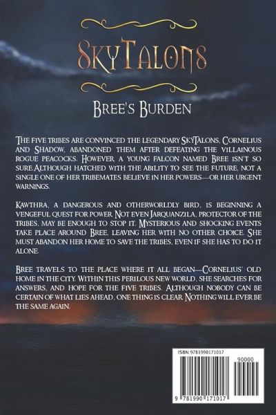 The five tribes are convinced the legendary SkyTalons, Cornelius and Shadow, abandoned them after defeating the villainous rogue peacocks. However, a young falcon named Bree isn't so sure. Although hatched with the ability to see the future, not a single one of her tribemates believe in her powers-or her urgent warnings. Kawthra, a dangerous and otherworldly bird, is beginning a vengeful quest for power. Not even Jarquanzila, protector of the tribes, may be enough to stop it. Mysterious and shocking events take place around Bree, leaving her with no other choice. She must abandon her home to save the tribes, even if she has to do it alone. Bree travels to the place where it all began-Cornelius' old home in the city. Within this perilous new world, she searches for answers, and hope for the five tribes. Although nobody can be certain of what lies ahead, one thing is clear. Nothing will ever be the same again.