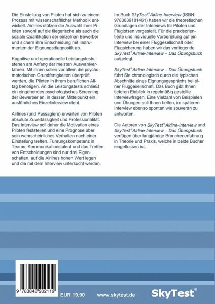 Die Einstellung von Piloten hat sich zu einem Prozess mit wissenschaftlicher Methodik entwickelt. Airlines stützen die Auswahl ihrer Piloten sowohl auf die fliegerische als auch die soziale Qualifikation der einzelnen Bewerber und sichern ihre Entscheidung mit Instrumenten der Eignungsdiagnostik ab. Kognitive und operationelle Leistungstests stehen am Anfang der meisten Auswahlverfahren. Mit ihnen sollen vor allem die psychomotorischen Grundfertigkeiten überprüft werden, die Piloten in ihrem beruflichen Alltag benötigen. An die Leistungstests schließt ein eingehendes psychologisches Screening der Bewerber an, in dessen Mittelpunkt ein ausführliches Einzelinterview steht. Airlines (und Passagiere) erwarten von Piloten absolute Zuverlässigkeit und Professionalität. Das Interview soll daher die Motivation eines Piloten feststellen und eine Prognose über sein wahrscheinliches Verhalten nach einer Einstellung treffen. Führungskompetenz in Teams, Kommunikationstalent und das Treffen von Entscheidungen sind nur drei Eigenschaften, auf die Airlines hohen Wert legen und die mit dem Interview untersucht werden. In SkyTest® Airline-Interview (ISBN: 9783839181461) haben wir die theoretischen Grundlagen der Interviews für Piloten und Fluglotsen vorgestellt. Für die praxisorientierte und individuelle Vorbereitung auf ein Interview bei einer Fluggesellschaft oder Flugsicherung haben wir das vorliegende SkyTest® Airline-Interview - Das Übungsbuch aufgelegt. SkyTest® Airline-Interview - Das Übungsbuch führt Sie chronologisch durch die typischen Abschnitte eines Eignungsgesprächs bei einer Fluggesellschaft. Das Buch gibt Ihnen tieferen Einblick in regelmäßig gestellte Interviewfragen. Eine Vielzahl von Beispielen und Übungen soll Ihnen helfen, im späteren Interview ebenso spontan wie souverän zu antworten.Die Autoren von SkyTest® Airline-Interview und SkyTest® Airline-Interview - Das Übungsbuch verfügen über langjährige Branchenerfahrung in Theorie und Praxis, die in beide Bücher eingeflossen ist.