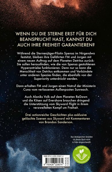Zusammen mit Co-Autorin Janci Patterson hat Bestseller-Autor Brandon Sanderson sein Science-Fiction-Universum rund um die junge Pilotin Spensa um drei actiongeladene Kurzgeschichten erweitert: Die Erzählungen »Sunreach«, »ReDawn« und »Evershore« werden aus der Perspektive von Spensas Freunden erzählt und spielen zwischen »Starsight« und »Cytonic« bzw. während der Ereignisse von »Cytonic«