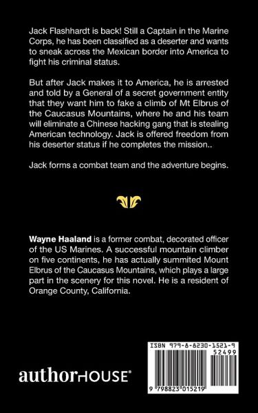Jack Flashhardt is back! Still a Captain in the Marine Corps, he has been classified as a deserter and wants to sneak across the Mexican border into America to fight his criminal status. But after Jack makes it to America, he is arrested and told by a General of a secret government entity that they want him to fake a climb of Mt Elbrus of the Caucasus Mountains, where he and his team will eliminate a Chinese hacking gang that is stealing American technology. Jack is offered freedom from his deserter status if he completes the mission.. Jack forms a combat team and the adventure begins.