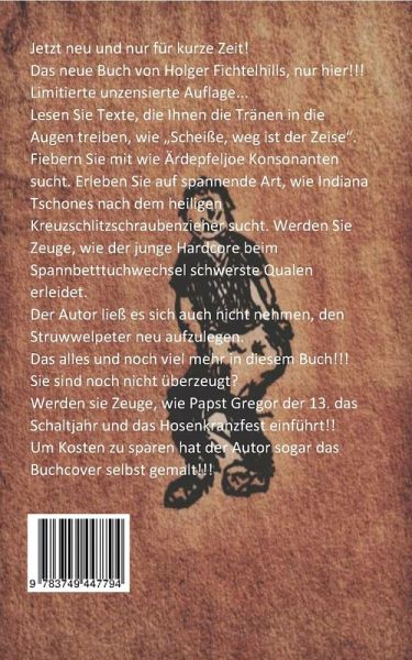 Jetzt neu und das nur für kurze Zeit! Das neue Buch von Holger Fichtelhills nur hier!!! Limitierte unzensierte Auflage... Lesen Sie Texte die ihnen die Tränen in die Augen treiben, wie Scheiße, weg ist der Zeise. Fiebern Sie mit wie Ärdepfeljoe Konsonanten sucht. Erleben Sie aufspannende Art wie Indiana Tschones nach dem heiligen Kreuzschlitzschraubenzieher sucht. Werden Sie Zeuge wie der junge Hardcore beim Spannbetttuchwechsel schwerste Qualen erleidet. Der Autor ließ es sich auch nicht nehmen den Struwwelpeter neu aufzulegen. Das alles und noch viel mehr in diesem Buch!!! Jetzt nur für 8,50 Euro... Sie sind noch nicht überzeugt? Werden sie Zeuge wie Papst Gregor der 13. das Schaltjahr und das Hosenkranzfest einführt!! Nur für 8 Euro Um Kosten zu sparen hat der Autor sogar das Buchcover selbst gemalt!!!Dieses macht dieses Buch zu diesen Büchern die diese Menschen Lesen