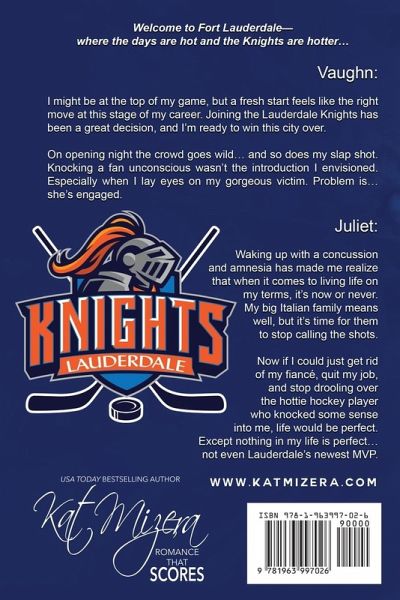 Welcome to Fort Lauderdale-where the days are hot and the Knights are hotter... Vaughn: I might be at the top of my game, but a fresh start feels like the right move at this stage of my career. Joining the Lauderdale Knights has been a great decision, and I'm ready to win this city over. On opening night the crowd goes wild... and so does my slap shot. Knocking a fan unconscious wasn't the introduction I envisioned. Especially when I lay eyes on my gorgeous victim. Problem is... she's engaged. Juliet: Waking up with a concussion and amnesia has made me realize that when it comes to living life on my terms, it's now or never. My big Italian family means well, but it's time for them to stop calling the shots. Now if I could just get rid of my fiancé, quit my job, and stop drooling over the hottie hockey player who knocked some sense into me, life would be perfect. Except nothing in my life is perfect... not even Lauderdale's newest MVP.