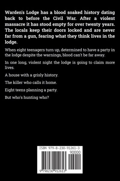 Warden's Lodge has a blood soaked history dating back to before the Civil War. After a violent massacre it has stood empty for over twenty years. The locals keep their doors locked and are never far from a gun, fearing what they think lives in the lodge. When eight teenagers turn up, determined to have a party in the lodge despite the warnings, blood can't be far away. In one long, violent night the lodge is going to claim more lives. A house with a grisly history. The killer who calls it home. Eight teens planning a party. But who's hunting who?