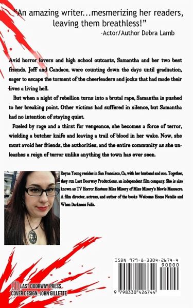 Horror lovers and high school outcasts, Samantha and her two best friends were counting down the days until graduation, eager to escape the torment of the popular cliques that had made their lives a living hell. But when a night of rebellion turns into a brutal rape, Samantha is pushed to her breaking point. Other victims had suffered in silence, but Samantha had no intention of staying quiet. Fueled by rage and a thirst for vengeance, she becomes a force of terror, wielding a butcher knife and leaving a trail of blood in her wake. Now, she must avoid her friends, the authorities, and the entire community as she unleashes a reign of terror unlike anything the town has ever seen.