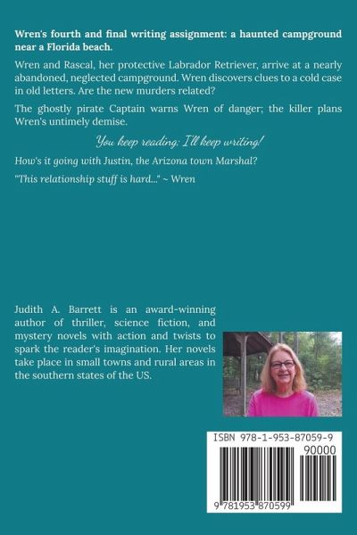 Wren's fourth and final writing assignment: a haunted campground near a Florida beach. Wren and Rascal, her protective Labrador Retriever, arrive at a nearly abandoned, neglected campground. Wren discovers clues to a cold case in old letters. Are the new murders related? The ghostly pirate Captain warns Wren of danger; the killer plans Wren's untimely demise. How's it going with Justin, the Arizona town Marshal? "This relationship stuff is hard..." ~ Wren