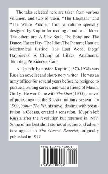 The tales selected here are taken from various volumes, and two of them, "The Elephant" and "The White Poodle," from a volume specially designed by Kuprin for reading aloud to children. The others are: A Slav Soul; The Song and The Dance; Easter Day; The Idiot; The Picture; Hamlet; Mechanical Justice; The Last Word; Dogs' Happiness; A Clump of Lilacs; Anathema; Tempting Providence; Cain. Aleksandr Ivanovich Kuprin (1870-1938) was Russian novelist and short-story writer. He was an army officer for several years before he resigned to pursue a writing career, and was a friend of Maxim Gorky. He won fame with The Duel (1905), a novel of protest against the Russian military system. In 1909, Yama: The Pit, his novel dealing with prostitution in Odessa, created a sensation. Kuprin left Russia after the revolution but returned in 1937. Some of his best short stories of action and adventure appear in The Garnet Bracelet, originally published in 1917.