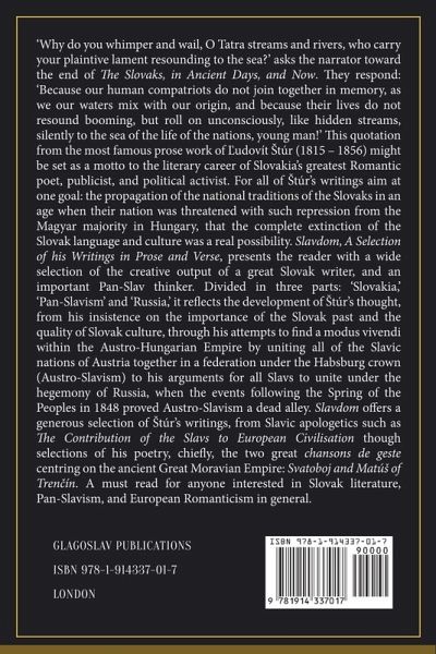 'Why do you whimper and wail, O Tatra streams and rivers, who carry your plaintive lament resounding to the sea?' asks the narrator toward the end of The Slovaks, in Ancient Days, and Now. They respond: 'Because our human compatriots do not join together in memory, as we our waters mix with our origin, and because their lives do not resound booming, but roll on unconsciously, like hidden streams, silently to the sea of the life of the nations, young man!' This quotation from the most famous prose work of ¿udovít ¿túr (1815 - 1856) might be set as a motto to the literary career of Slovakia's greatest Romantic poet, publicist, and political activist. For all of ¿túr's writings aim at one goal: the propagation of the national traditions of the Slovaks in an age when their nation was threatened with such repression from the Magyar majority in Hungary, that the complete extinction of the Slovak language and culture was a real possibility. Slavdom: A Selection of his Writings in Prose and Verse, presents the reader with a wide selection of the creative output of a great Slovak writer, and an important Pan-Slav thinker. Divided in three parts: 'Slovakia,' 'Pan-Slavism' and 'Russia,' it reflects the development of ¿túr's thought, from his insistence on the importance of the Slovak past and the quality of Slovak culture, through his attempts to find a modus vivendi within the Austro-Hungarian Empire by uniting all of the Slavic nations of Austria together in a federation under the Habsburg crown (Austro-Slavism) to his arguments for all Slavs to unite under the hegemony of Russia, when the events following the Spring of the Peoples in 1848 proved Austro-Slavism a dead alley. Slavdom offers a generous selection of ¿túr's writings, from Slavic apologetics such as The Contribution of the Slavs to European Civilisation though selections of his poetry, chiefly, the two great chansons de geste centring on the ancient Great Moravian Empire: Svatoboj and Matú¿ of Tren¿ín. A must read for anyone interested in Slovak literature, Pan-Slavism, and European Romanticism in general. This book was published with a financial support from SLOLIA, Centre for Information on Literature in Bratislava.
