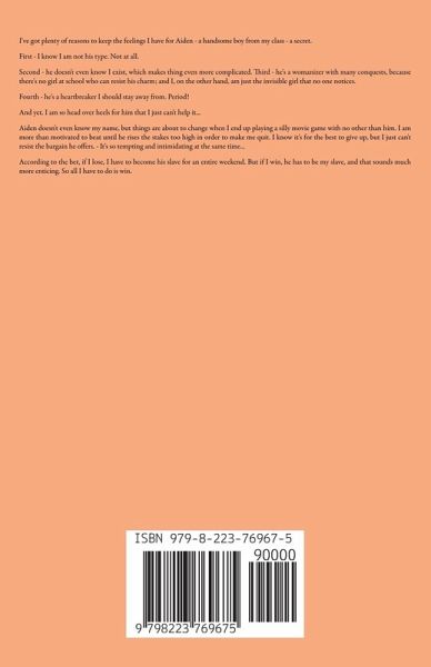 I've got plenty of reasons to keep the feelings I have for Aiden - a handsome boy from my class - a secret. First - I know I am not his type. Not at all. Second - he doesn't even know I exist, which makes things even more complicated. Third - he's a womanizer with many conquests, because there's no girl at school who can resist his charm; and I, on the other hand, am just the invisible girl that no one notices. Fourth - he's a heartbreaker that I should stay away from. Period! And yet. I am so head over heels for him that I just can't help it... Aiden doesn't even know my name, but things are about to change when I end up playing a silly movie game with no other than him. I am more than motivated to beat until he rises the stakes too high in order to make me quit. I know it's for the best to give up, but I just can't resist the bargain he offers. - It's so tempting and intimidating at the same time... According to the bet, if I lose, I have to become his slave for an entire weekend. But if I win, he has to be my slave, and that sounds much more enticing. So all I have to do is win.