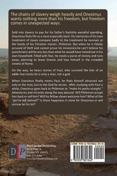 Sold into slavery to pay for his father's foolishly wasteful spending, Onesimus finds life as a slave especially hard. His memories of his own treatment of slaves compare badly to the treatment he receives at the hands of his Christian master, Philemon. But when he is falsely accused of theft and cannot prove his innocence,he can't believe his punishment will be any less than what he would have meted out in his own household. Filled with fear, he steals a purse of money and runs away, planning to leave Greece and lose himself in the crowded streets of Rome. On the way, he hears stories of Paul, who survived the bite of an adder but insists he is only a man, not a god. When Onesimus finally meets Paul, he finds himself attracted not only to the man, but to the God he serves. After studying with Paul a while,Onesimus goes back to Philemon to "make his paths straight." Adventures and miracles along the way abound.Will Philemon accept him back or sell him? Will his fellow-slaves welcome him? What of the "girl he left behind?" Is there happiness in store for Onesimus or will sorrow be his lot?