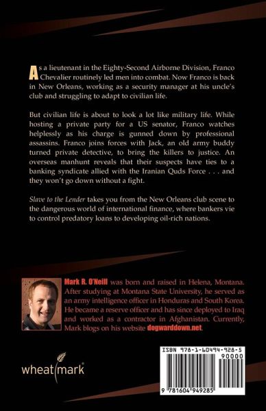 As a lieutenant in the Eighty-Second Airborne Division, Franco Chevalier routinely led men into combat. Now Franco is back in New Orleans, working as a security manager at his uncle's club and struggling to adapt to civilian life. But civilian life is about to look a lot like military life. While hosting a private party for a US senator, Franco watches helplessly as his charge is gunned down by professional assassins. Franco joins forces with Jack, an old army buddy turned private detective, to bring the killers to justice. An overseas manhunt reveals that their suspects have ties to a banking syndicate allied with the Iranian Quds Force ... and they won't go down without a fight. Slave to the Lender takes you from the New Orleans club scene to the dangerous world of international finance, where bankers vie to control predatory loans to developing oil-rich nations. Mark R. O'Neill was born and raised in Helena, Montana. After studying at Montana State University, he served as an army intelligence officer in Honduras and South Korea. He became a reserve officer and has since deployed to Iraq and worked as a contractor in Afghanistan. Currently, Mark blogs on his website dogwarddown.net.