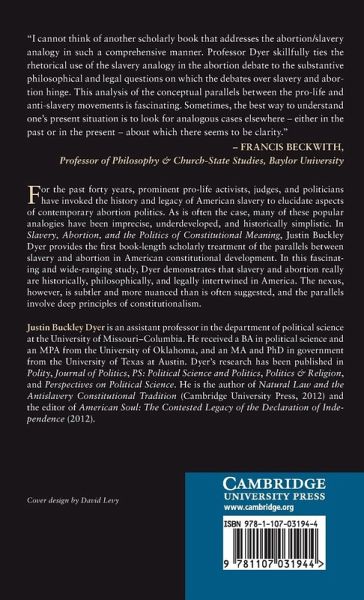 For the past forty years, prominent pro-life activists, judges and politicians have invoked the history and legacy of American slavery to elucidate aspects of contemporary abortion politics. As is often the case, many of these popular analogies have been imprecise, underdeveloped and historically simplistic. In Slavery, Abortion, and the Politics of Constitutional Meaning, Justin Buckley Dyer provides the first book-length scholarly treatment of the parallels between slavery and abortion in American constitutional development. In this fascinating and wide-ranging study, Dyer demonstrates that slavery and abortion really are historically, philosophically and legally intertwined in America. The nexus, however, is subtler and more nuanced than is often suggested, and the parallels involve deep principles of constitutionalism.