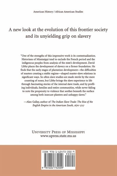 Slavery and Frontier Mississippi, 1720-1835 By David J. Libby In the popular imagination the picture of slavery, frozen in time, is one of huge cotton plantations and opulent mansions. However, in over a hundred years of history detailed in this book, the hard reality of slavery in Mississippi's antebellum world is strikingly different from the one of popular myth. It shows that Mississippi's past was never frozen, but always fluid. It shows too that slavery took a number of shapes before its form in the late antebellum mold became crystalized for popular culture. The colonial French introduced African slaves into this borderlands region situated on the periphery of French, Spanish, and English settlements. In this frontier, planter society made unsuccessful attempts to produce tobacco, lumber, and indigo. Slavery outlasted each failed harvest. Through each era, plantation culture rode the back of a system far removed from the romantic stereotype. Almost simultaneously as Mississippi became a United States territory in the 1790s, cotton became the cash crop. The booming King Cotton economy changed Mississippi and adopted the slave system that was its foundation. Some Mississippi slaves resisted this grim oppression and rebelled by flight, work slowdowns, arson, and conspiracy. In 1835 a slave conspiracy in Madison County provoked such draconian response among local slave holders that planters throughout the state redoubled the iron locks on the system. Race relations in the state remained radicalized for many generations to follow. Beginning with the arrival of the first African slaves in the colony and extending over 115 years, this book is the first such history since Charles Sydnor's Slavery in Mississippi (1933). David J. Libby is an independent scholar.