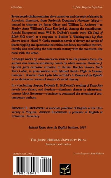 Seven noted scholars examine slave narratives and the topic of slavery in American literature, from Frederick Douglass's Narrative (1845)-- treated in chapters by James Olney and William L. Andrews-- to Sheley Anne William's "Dessa Rose" (1984). Among the contributors, Arnold Rampersad reads W.E.B. DuBois's classic work "The Souls of Black Folk" (1903) as a response to Booker T. Washington's "Up from Slavery" (1901). Hazel V. Carby examines novels of slavery and novels of sharecropping and questions the critical tendency to conflate the two, thereby also conflating the nineteenth century with the twentieth, the rural with the urban. Although works by Afro-American writers are the primary focus, the authors also examine antislavery novels by white women. Hortense J. Spillers gives extensive attention to Harriet Beecher Stowe's "Uncle Tom's Cabin", in juxtaposition with Ishmael Reed's "Flight to Canada"; Carolyn L. Karcher reads Lydia Maria Child's "A Romance of the Republic" as an abolitionist vision of America's racial destiny. In a concluding chapter, Deborah E. McDowell's reading of "Desa Rose" reveals how slavery and freedom-- dominant themes in nineteenth-century black literature-- continue to command the attention of contemporary authors.