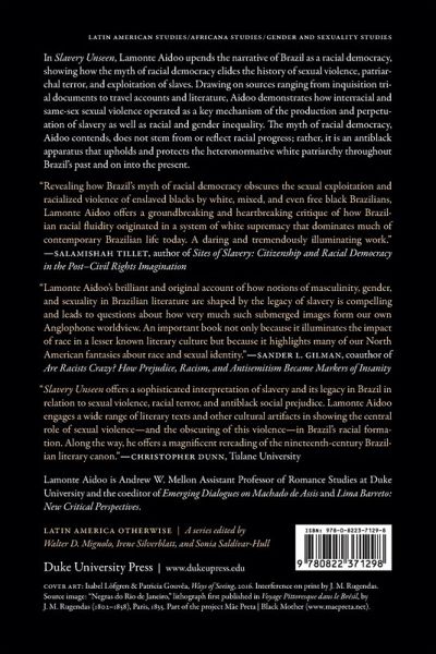 In Slavery Unseen, Lamonte Aidoo upends the narrative of Brazil as a racial democracy, showing how the myth of racial democracy elides the history of sexual violence, patriarchal terror, and exploitation of slaves. Drawing on sources ranging from inquisition trial documents to travel accounts and literature, Aidoo demonstrates how interracial and same-sex sexual violence operated as a key mechanism of the production and perpetuation of slavery as well as racial and gender inequality. The myth of racial democracy, Aidoo contends, does not stem from or reflect racial progress; rather, it is an antiblack apparatus that upholds and protects the heteronormative white patriarchy throughout Brazil's past and on into the present.