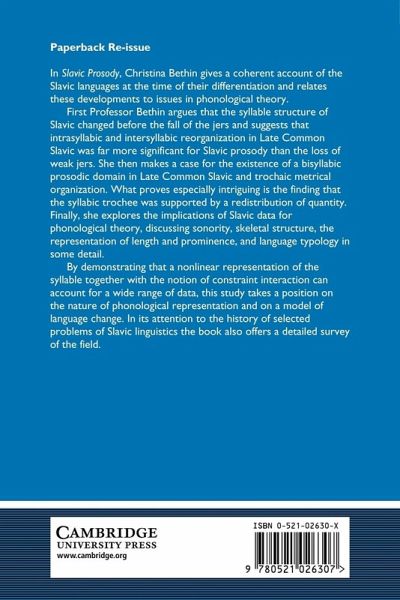 In Slavic Prosody Professor Bethin gives a coherent account of the Slavic languages at the time of their differentiation and relates these developments to issues in phonological theory. First Professor Bethin argues that the syllable structure of Slavic changed before the fall of the jers and suggests that intrasyllabic and intersyllabic reorganization in Late Common Slavic was far more significant for Slavic prosody than the loss of weak jers. She then makes a case for the existence of a bisyllabic prosodic domain in Late Common Slavic and trochaic metrical organization. Finally, she explores the implications of Slavic data for phonological theory, discussing sonority, skeletal structure, the representation of length and prominence, and language typology in some detail.