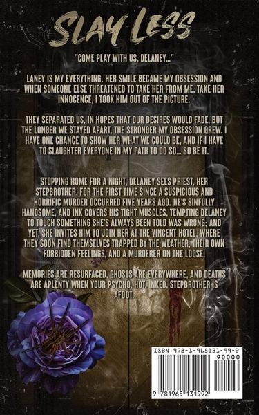 "Come play with us, Delaney..." Laney is my everything. Her smile became my obsession and when someone else threatened to take her from me, take her innocence, I took him out of the picture. They separated us, in hopes that our desires would fade, but the longer we stayed apart, the stronger my obsession grew. I have one chance to show her what we could be, and if I have to slaughter everyone in my path to do so... so be it. Stopping home for a night, Delaney sees Priest, her stepbrother, for the first time since a suspicious and horrific murder occurred five years ago. He's sinfully handsome, and ink covers his tight muscles, tempting Delaney to touch something she's always been told was wrong; and yet, she invites him to join her at the Vincent hotel, where they soon find themselves trapped by the weather, their own forbidden feelings, and a murderer on the loose. Memories are resurfaced, ghosts are everywhere, and deaths are aplenty when your psycho, hot, inked, stepbrother is afoot. Slay Less is a forbidden horror romance standalone with a HEA.