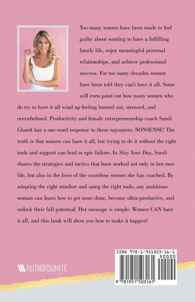 Too many women have been made to feel guilty about wanting to have a fulfilling family life, enjoy meaningful personal relationships, and achieve professional success. For too many decades women have been told they can't have it all. Some will even point out how many women who do try to have it all wind up feeling burned out, stressed, and overwhelmed. Productivity and female entrepreneurship coach Sandra Glandt has a one-word response to these naysayers: NONSENSE! The truth is that women can have it all, but trying to do it without the right tools and support can lead to epic failure. In Slay Your Day, Sandi shares the strategies and tactics that have worked not only in her own life, but also in the lives of the countless women she has coached. By adopting the right mindset and using the right tools, any ambitious woman can learn how to get more done, become ultra-productive, and unlock their full potential. Her message is simple: Women CAN have it all, and this book will show you how to make it happen!