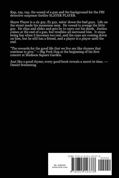 Rap, rap, rap, the sound of a gun going off and the background theme for the novel. Slayer Player is a novel of suspense about a black, rap music producer who takes revenge into his own hands and assassinates five men who are abusers of children. Chase takes place from a middle aged female agent and her new, young, male partner. The book takes place in a world of rap music and rap music production. Slayer Player is a sly guy, fly guy, takin' down the bad guys. Life on the street made his meanness neat. He vowed to avenge the little guy. He slips and slides and gets by to carry out his deeds. Justice comes at the end of his gun, but troubles all surround him. It stops being fun when it becomes to real, and the cops are coming down on him, but he still has a friend, and a player is a player until the end.