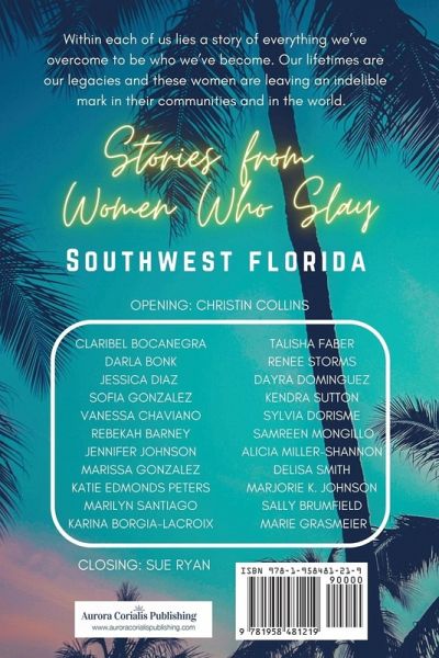 Within each of us lies a story of everything we've overcome to be who we've become. Our lifetimes are our legacies, and these women are leaving an indelible mark in their communities and in the world. With stories collected by Leigh M. Clark, these are women who slay Southwest Florida. Part of the Slay the USA series. Opening: Christin Collins Closing: Sue Ryan Featuring: Claribel Bocanegra, Darla Bonk, Karina Borgia-Lacroix, Jessica Diaz, Sofia Gonzales, Vanessa M. Chaviano, Rebekah Alzada Barney, Jennifer Johnson, Marissa Gonzalez, Katie Edmonds Peters, Marilyn Santiago, Talisha Faber, Dayra "Dee" Dominguez, Kendra Sutton, Sylvia Dorisme, Samreen Mongillo, Delisa Smith, Marjorie K. Johnson, Sally Brumfield, Marie J. Grasmeier, Alicia Miller-Shannon, Renee Storms