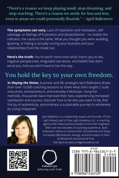 Slaying the Onion: Unveil the Layers of Your Story to Reveal Your Highest Potential "There's a reason we keep playing small, stop dreaming, and stop reaching. There's a reason we settle for less and less, even in areas we could potentially flourish." - April Ballestero The symptoms can vary. Lack of inspiration and motivation, self-sabotage, or feelings of frustration and dissatisfaction--no matter the indicator, the cause is the same. What you thought you were avoiding, ignoring, or hiding is actually ruining your business and your relationships from the inside out. Here's the truth: You're worth more than what chains you to lies, negative perspectives, misguided narratives, and beliefs that don't serve you. And you don't have to live this way. You hold the key to your own freedom. In Slaying the Onion, business and life strategist April Ballestero draws from over 10,000 coaching sessions to share what she's taught C-suite executives, entrepreneurs, and everyday individuals. Using her methods, thousands have improved their lives, experiencing increased satisfaction and success. Discover how to be who you want to be, find the joy of authenticity, and embrace a sustainable journey to wholeness by Living Unlayered.