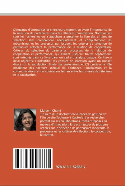 Dirigeants d'entreprises et chercheurs mettent en avant l'importance de la sélection de partenaires dans les alliances d'innovation. Nombreuses sont les recherches qui s'attachent à présenter la liste des critères de sélection sans comprendre adéquatement et complètement les mécanismes et les processus par lesquels les critères de sélection de partenaires affectent la performance de la relation de coopération. Critères de sélection de partenaires, processus de la relation de coopération et performance, qui étaient jusqu'ici traités séparément, sont intégrés dans ce livre dans un cadre d'analyse unique. Ce livre a deux objectifs: (1)identifier les critères de sélection ayant un impact direct sur la satisfaction finale des partenaires; et (2) préciser le rôle médiateur des facteurs sociaux (la confiance, l'implication et la communication) et du contrat sur le lien entre les critères de sélection et la satisfaction.