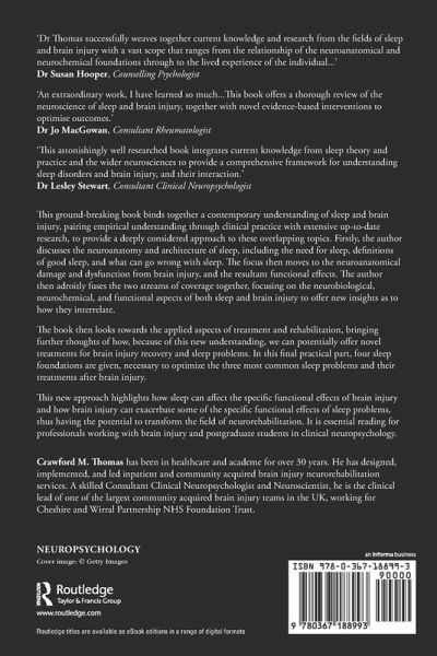 "Dr Thomas successfully weaves together current knowledge and research from the fields of sleep and brain injury with a vast scope that ranges from the relationship of the neuroanatomical and neurochemical foundations through to the lived experience of the individual. The book expertly constructs a deep appreciation of the complexity and interrelatedness of the extensive ecosystem that is sleep and waking as it structures and encompasses all aspects of life. Based on the intricacies of the above, a complete sleep management approach is offered to promote healthy sleep and waking, which makes clear how things might be improved for those who have experienced a brain injury. It is a must read for anyone working in this area." - Dr Susan Hooper, BSc (Hons), Cert. Ed, MSc, D Couns Psych, Cert. Rehab, Chartered Psychologist, Registered Counselling Psychologist, HCPC