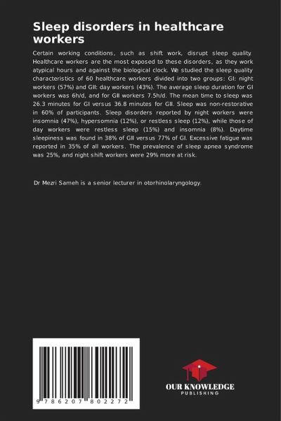Certain working conditions, such as shift work, disrupt sleep quality. Healthcare workers are the most exposed to these disorders, as they work atypical hours and against the biological clock. We studied the sleep quality characteristics of 60 healthcare workers divided into two groups: GI: night workers (57%) and GII: day workers (43%). The average sleep duration for GI workers was 6h/d, and for GII workers 7.5h/d. The mean time to sleep was 26.3 minutes for GI versus 36.8 minutes for GII. Sleep was non-restorative in 60% of participants. Sleep disorders reported by night workers were insomnia (47%), hypersomnia (12%), or restless sleep (12%), while those of day workers were restless sleep (15%) and insomnia (8%). Daytime sleepiness was found in 38% of GII versus 77% of GI. Excessive fatigue was reported in 35% of all workers. The prevalence of sleep apnea syndrome was 25%, and night shift workers were 29% more at risk.