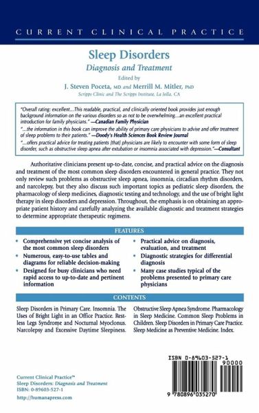 Overall rating: excellent...This readable, practical, and clinically oriented book provides just enough background information on the various disorders so as not to be overwhelming....an excellent practical introduction for family physicians. -Canadian Family Physician ...the information in this book can improve the ability of primary care physicians to advise and offer treatment of sleep problems to their patients.-Doody's Health Sciences Book Review Journal ...offers practical advice for treating patients [that] physicians are likely to encounter with some form of sleep disorder, such as obstructive sleep apnea after extubation or insomnia associated with depression.--Consultant "Sleep Disorders: Diagnosis and Treatment is recommended for all health science libraries."-E Streams
