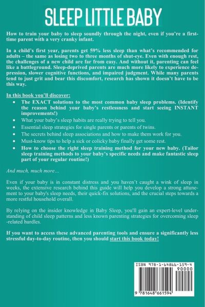 How to train your baby to sleep soundly through the night, even if you're a first-time parent with a very cranky infant. In a child's first year, parents get 59% less sleep than what's recommended for adults - the same as losing two to three months of shut-eye. Even with enough rest, the challenges of a new child are far from easy. And without it, parenting can feel like a battleground. Sleep-deprived parents are much more likely to experience depression, slower cognitive functions, and impaired judgment. While many parents tend to just grit and bear this discomfort, research has shown it doesn't have to be this way. In this book you'll discover:The EXACT solutions to the most common baby sleep problems. (Identify the reason behind your baby's restlessness and start seeing INSTANT improvements!)What your baby's sleep habits are really trying to tell you. Essential sleep strategies for single parents or parents of twins. The secrets behind sleep associations and how to make them work for you. Must-know tips to help a sick or colicky baby finally get some rest. How to choose the right sleep training method for your new baby. (Tailor sleep training methods to your baby's specific needs and make fantastic sleep part of your regular routine!) And much, much more... Even if your baby is in constant distress and you haven't caught a wink of sleep in weeks, the extensive research behind this guide will help you develop a strong attunement to your baby's sleep needs, their quick-fix solutions, and the crucial steps towards a more restful household overall. By relying on the insider knowledge in Baby Sleep, you'll gain an expert-level understanding of child sleep patterns and less known parenting strategies for overcoming sleep-related hurdles. If you want to access these advanced parenting tools and ensure a significantly less stressful day-to-day routine, then you should start this book today!